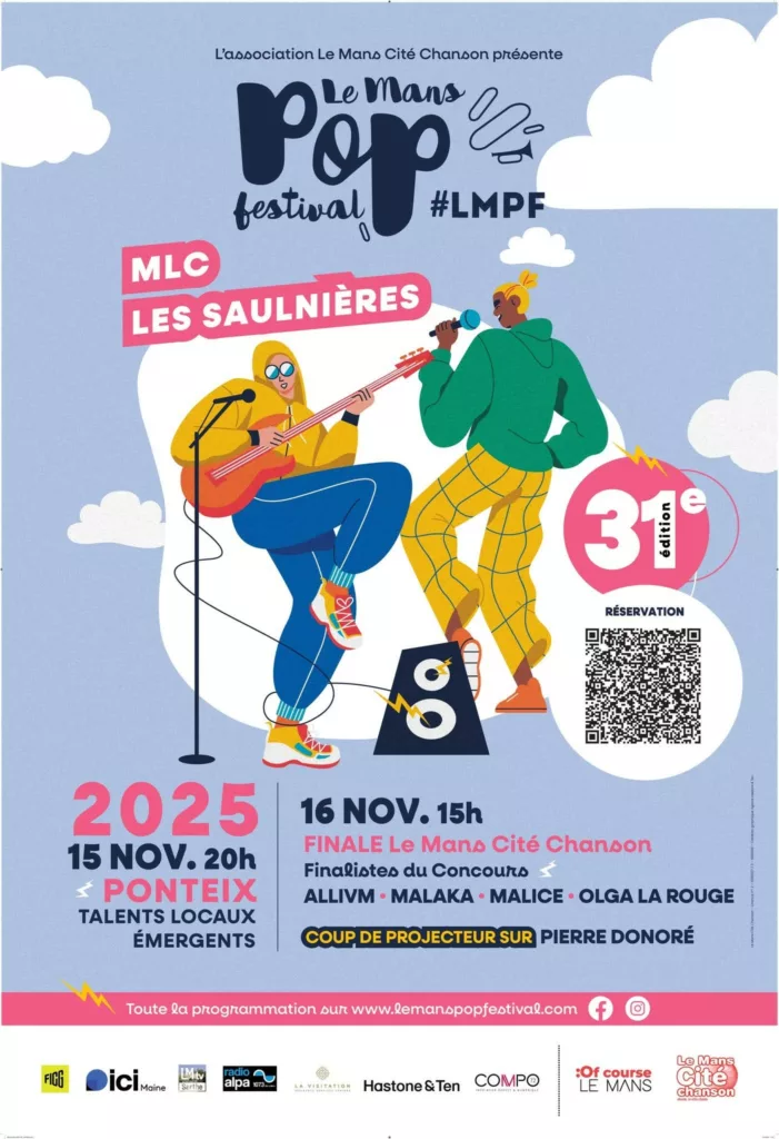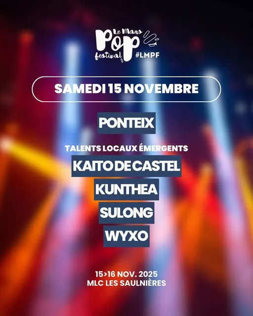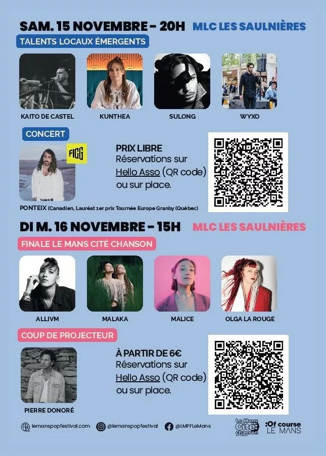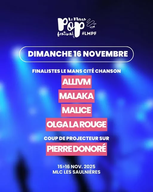 Les 15 & 16 Novembre 2025, c’est le 31ème Le Mans Pop Festival, avec une soirée concert d’artistes locaux émergents le samedi et la finale du concours Pop Chanson Francophone le dimanche.