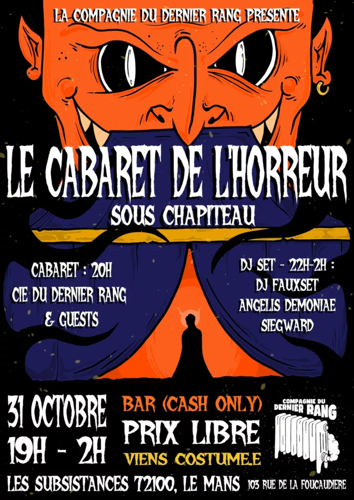 • 19h-2h Le Cabaret de l’horreur sous chapiteau : 20h spectacle, Dj set 22h-2h Prix libre, viens en costume, Les Subsistances, Le Mans