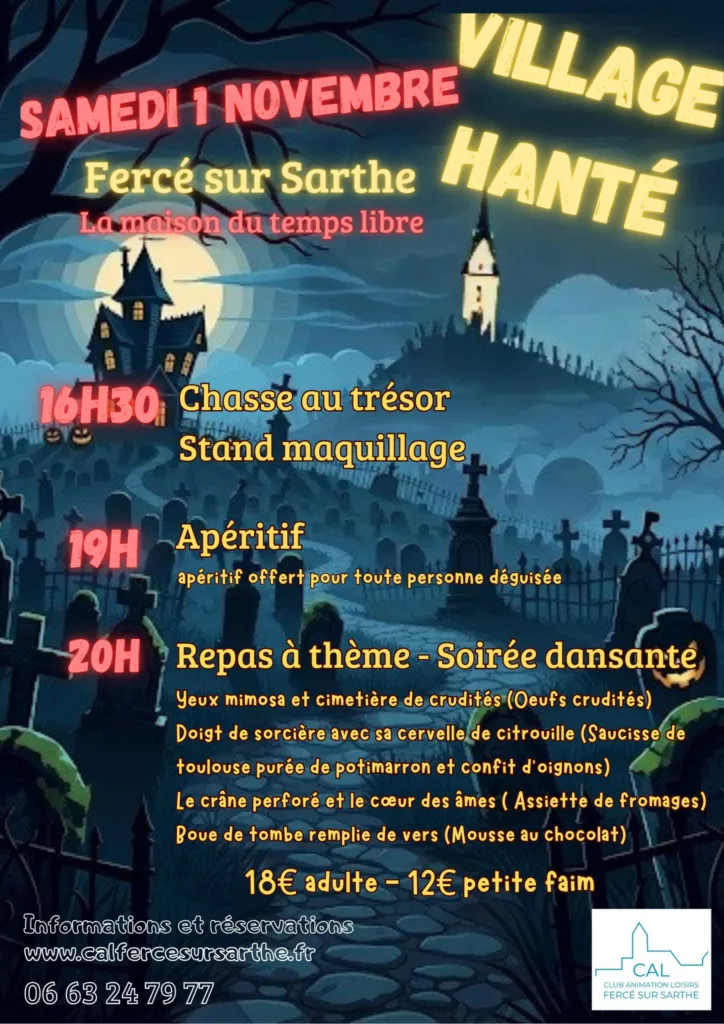• A partir de 16h30 Le Village hanté, maquillage, aperitif, repas Soirée dansante Halloween, Maison du temps libre à Fercé sur Sarthe (72) Repas 12 à 18 €