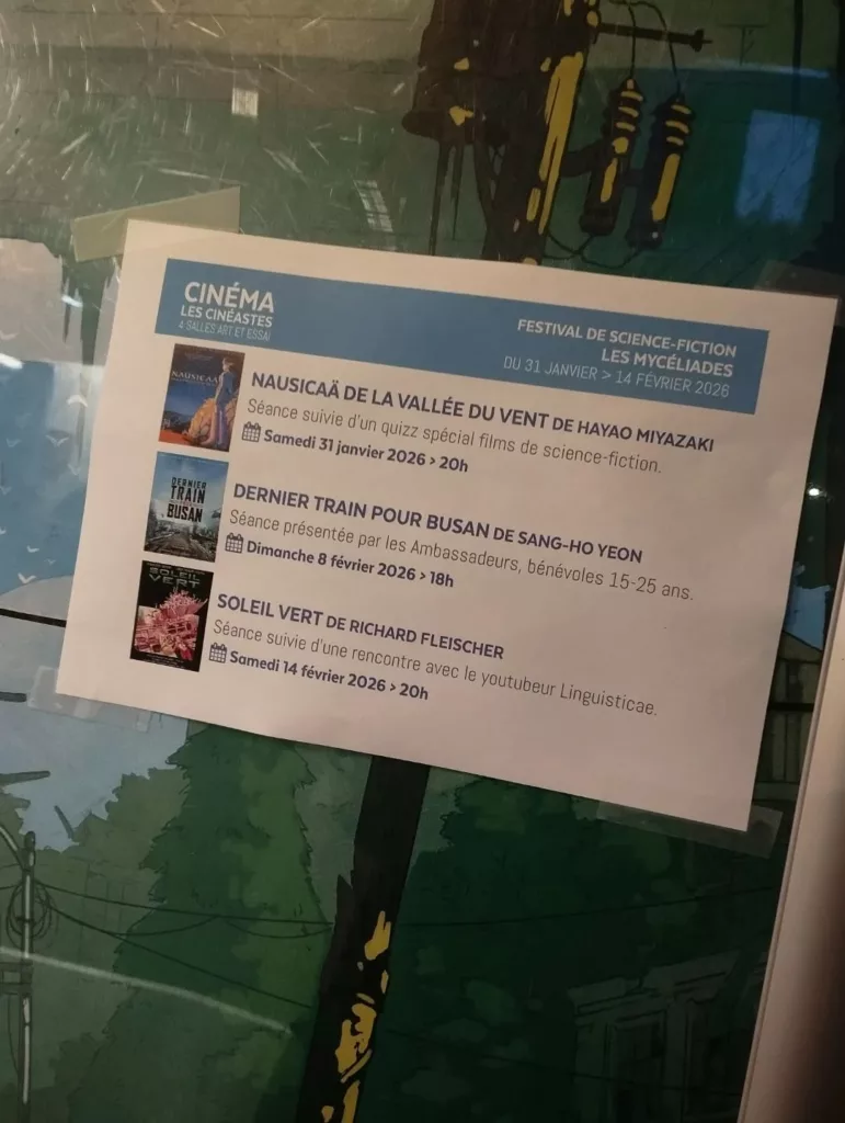 - 14 février 2026 à 20h Film « Soleil vert » (1h37, VOSTF) au Cinéma Les Cinéastes suivi d’un échange avec Monté, vulgarisateur en linguistique et sciences sociales, et créateur de la chaîne YouTube Linguisticae.