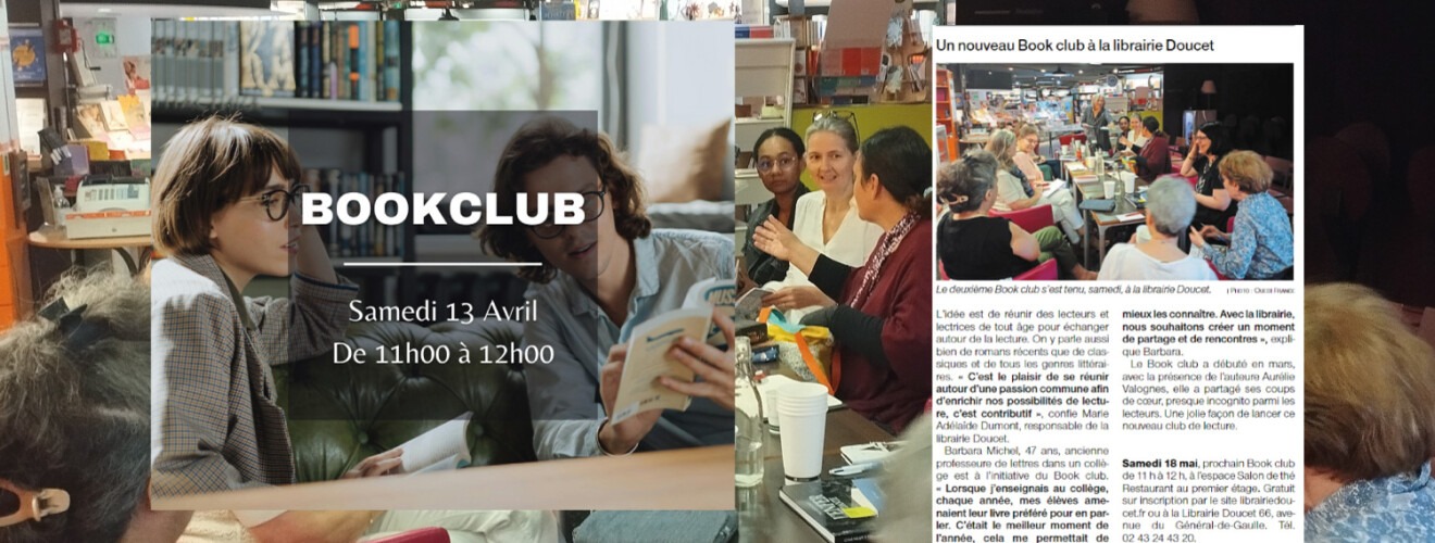 Le prochain Book Club sera le samedi 18 mai de 11h à 12h, sur inscription à la librairie Doucet, Le Mans.