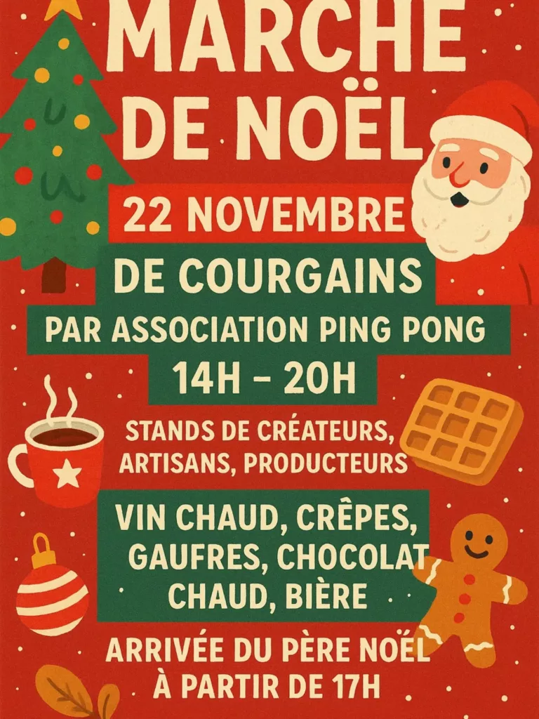 - Samedi 22 novembre 14h – 22h Marché de Noël de Courgains par l’association de Ping Pong, stands de créateurs, artisans, producteurs et maquillage par sab corneille, vin chaud, gaufre, chocolat, biere… arrivée du père noel à 17h