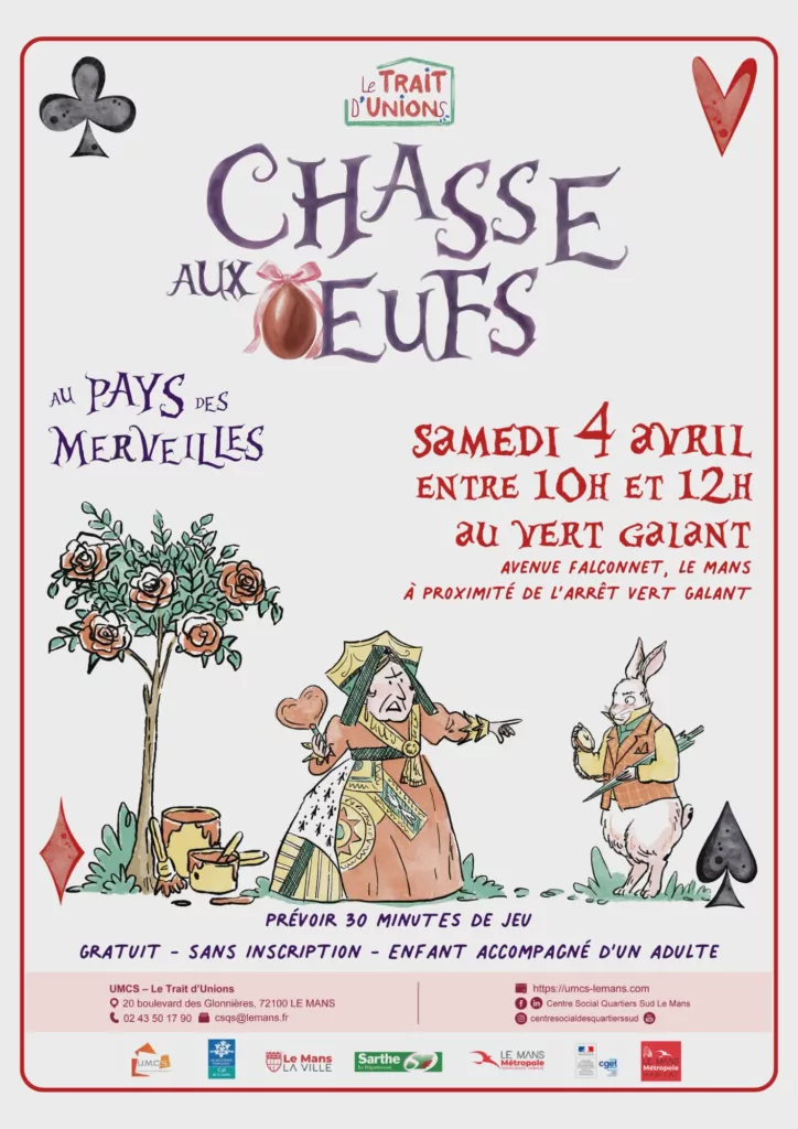 - Samedi 4 avril 2026, 10h-12h Chasse aux oeufs, Au pays des merveilles, Le Trait ‘unions au vert Galant, Gratuit