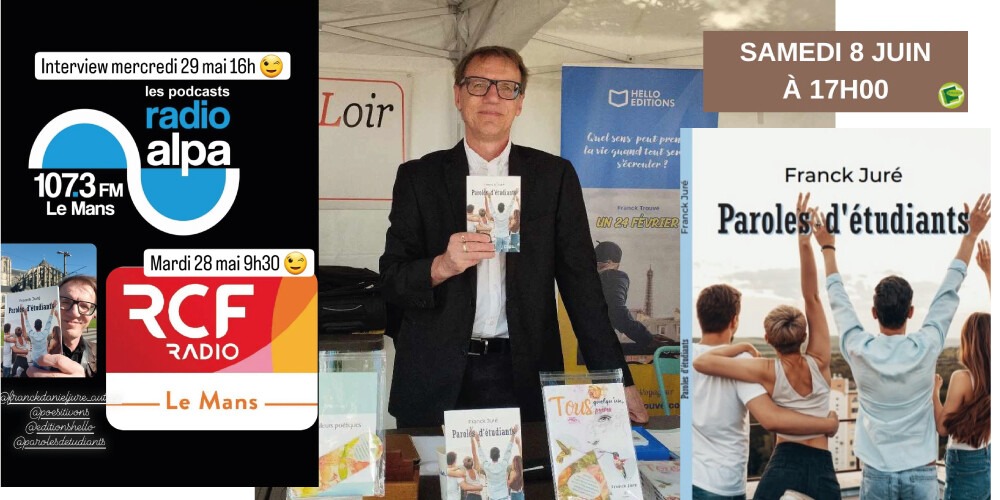 L’auteur et poète sarthois Franck Juré Auteur vous propose plusieurs dates pour vous parler de son nouvel ouvrage ‘Paroles d’étudiants’ (74 pages) paru en avril 2024 chez Hello Editions. Rencontrez l’auteur lors de sa venue à la Librairie Thuard le 8 juin 2024 à 17h.