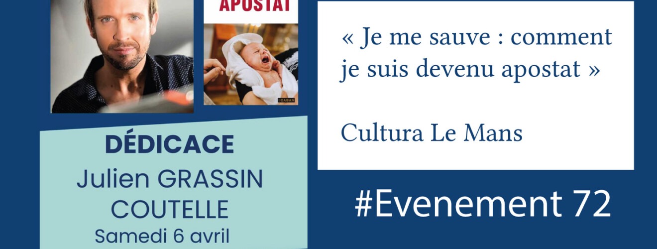 Retrouvez Julien Grassin Coutelle en séance de dédicaces pour son livre « JE ME SAUVE – COMMENT JE SUIS DEVENU APOSTAT », publié aux Éditions Rue de Seine, ce samedi 6 avril de 13h à 17h30 chez Cultura, au Mans.
